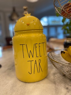 Speaking of housewives buying goods for the home, guilty as charged. I found a yellow cookie jar that I could not resist and brought it home to the Casa Kitchen just in time for Spring where I think it looks very jaunty…..