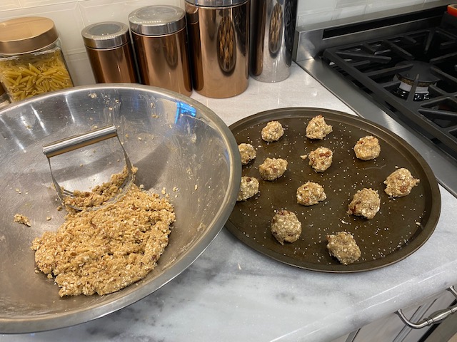 Mix the spices and nuts in the dough and add the remaining 3/4 cup of flour and 2 cups of rolled oats. I like to use a pastry knife for cookie dough like this and it helps to chop up the nuts as well. If the dough is too dry you can add water 1 tablespoon at a time until its the right consistency to form a shaped ball.