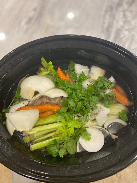 I started my Thanksgiving prep this past Sunday when I roasted a whole chicken for dinner and then used the carcass of the bird to make crock pot stock overnight. Crock Pot Stock is the easiest thing in the world to make–take your leftovers from a cooked whole chicken (can be a store bought roaster, no shame)–the leftover meat, bones, skin, gizzards–place in the bottom of a crock pot and add carrots, celery, onion, fresh parsley, salt and pepper, and whatever herbs you like–I used a bit of dill, rosemary and tarragon. The great thing about this stock is that you can put everything in the pot as is, no need to prep the veggies beyond a good rinsing and rough cut.
